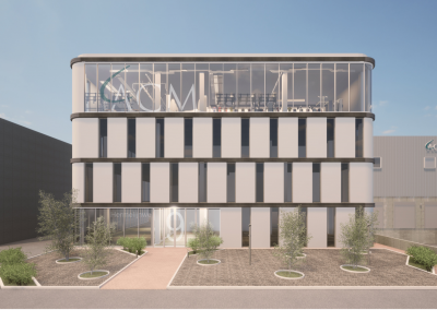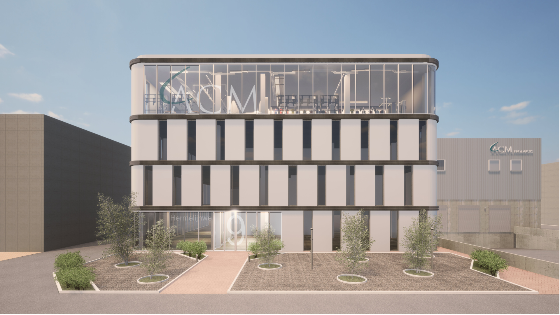 Het kantoor en showroom van ACM Products staat verschoven voor de distributiehallen naast de laaddokken. Een vleugel schuift door naast de voorhal.