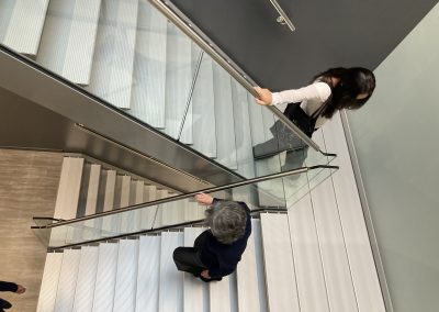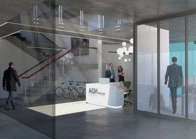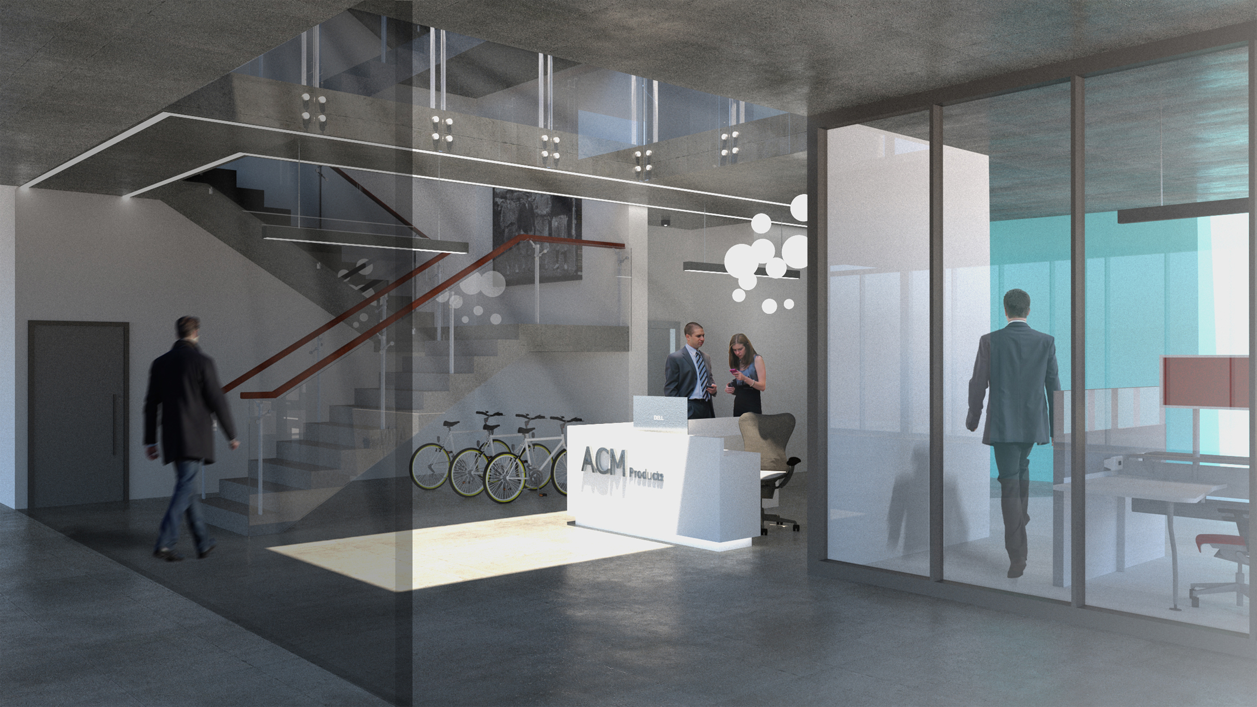 Het beeld van de entree en kantine beneden wordt uitgedrukt door een glazen pui die met een afronding de hoek om gaat. De showroom op de boven heeft een grotere hoogte dan de overige verdiepingen. De hoge pui gaat met een ronding de andere hoek om. Het ACM logo is hierop semi-transparant geprojecteerd.